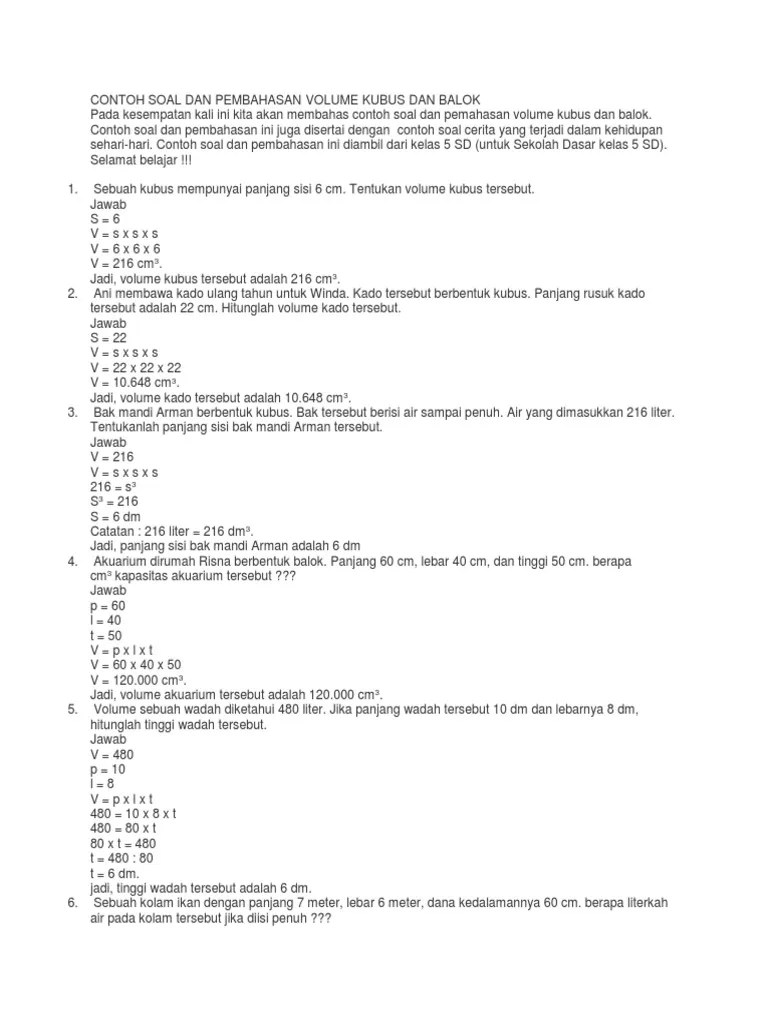 DOC) CONTOH SOAL DAN PEMBAHASAN VOLUME KUBUS DAN BALOK | Fatrina …